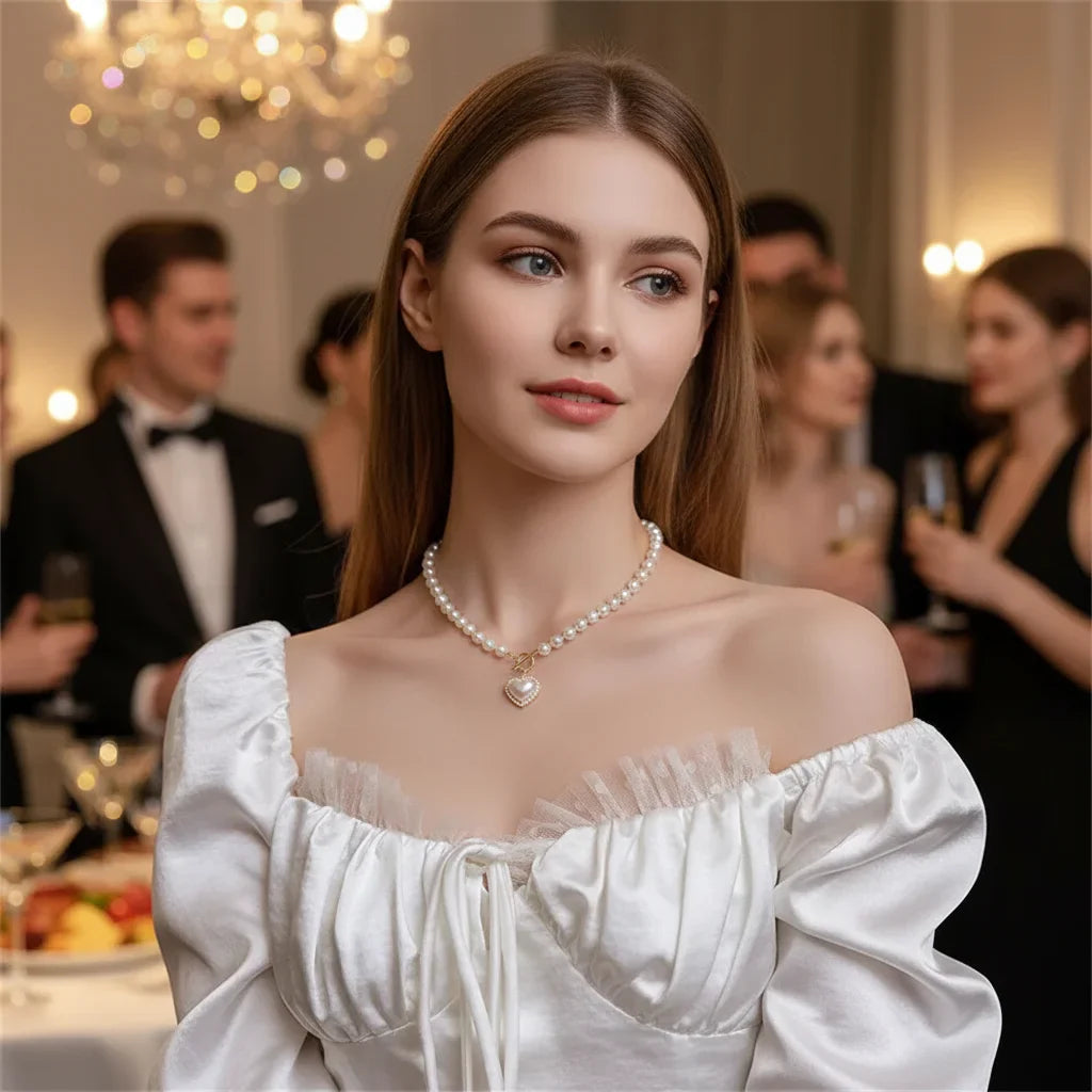 Nos perles d'imitation sont sélectionnées pour leur lustre délicat et leur uniformité parfaite, conférant à votre cou une douce lumière. Elles encadrent avec raffinement le cœur, créant une harmonie visuelle intemporelle et chic.